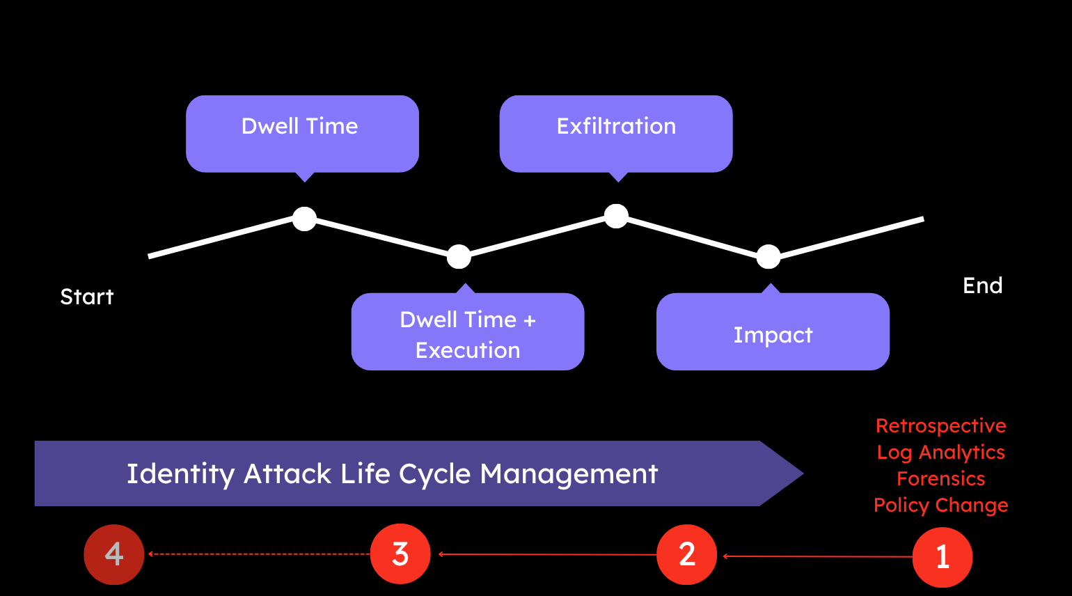 This results in many organisations operating at point 1 on the above schematic. IAM attack management really is more focused upon recovery – as the attack has already completed and the impact sorely felt. At best, a deep dive forensics investigation can result in changes to access and authentication policy, perhaps also the removal of accounts or permissions that were used.