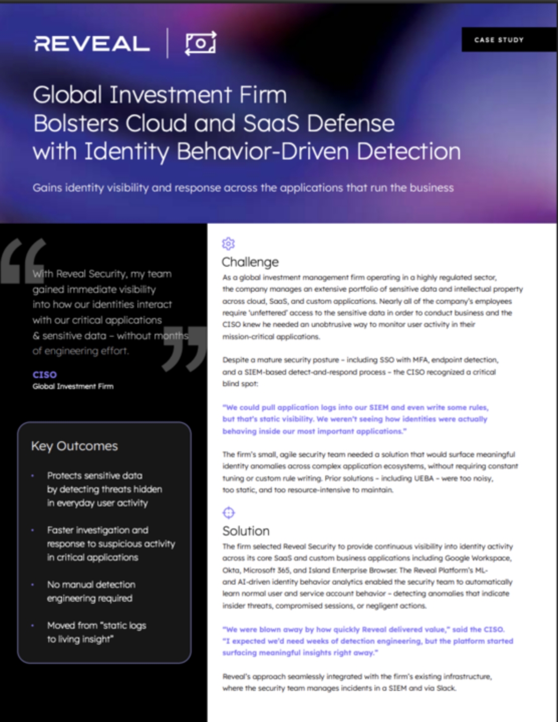 Global Investment FirmBolsters Cloud and SaaS Defensewith Identity Behavior-Driven Detection
